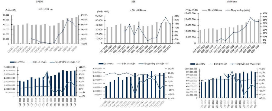 Theo quan sát của ông Khoa, lực cầu suy yếu trong hai phiên đầu tuần đã khiến cho VN-Index có những nỗ lực vượt ngưỡng cản gần quanh 1.13x bất thành. So sánh tương quan các thị trường trên thế giới, kết quả kinh doanh của các doanh nghiệp niêm yết tại Mỹ tiếp tục tăng trưởng ở mức 2 con số (bình quân khoảng 25% YoY trong 9T2023), các doanh nghiệp niêm yết tại Việt Nam và Trung Quốc lại có 3 quý kinh doanh tương đối kém khả quan với doanh thu gần như đi ngang trong khi lợi nhuận sau thuế tăng trưởng âm so với cùng kỳ.