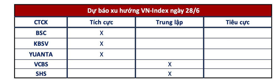 Thận trọng hơn, Chứng khoán Vietcombank (VCBS) đánh giáthị trường có thể sẽ giao dịch tích lũy và kiểm tra lại khu vực điểm số nêu trên trong các phiên sắp tới. VN-Index vẫn cần có được phiên bùng nổ thuyết phục đi cùng thanh khoản tốt để bứt phá hẳn ra khỏi khu vực sideway. VCBS khuyến nghị các nhà đầu tư nên duy trì tỉ trọng cổ phiếu hiện tại, bám sát diễn biến thị trường trong những phiên tới và chỉ giải ngân thêm khi thị trường có tín hiệu rõ ràng hơn thông qua việc gia tăng mạnh thanh khoản mua chủ động.