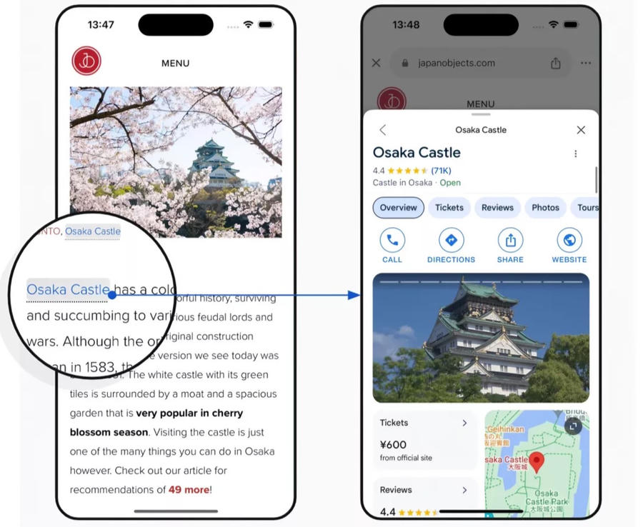 Google gọi đây là "chú thích trang" để phát hiện các tên, địa điểm và những thứ đáng chú ý được đề cập trên một trang web (có khả năng là mục tiêu tốt cho quảng cáo), làm nổi bật và biến chúng thành các đường link để tải thêm thông tin từ Google khi được chạm vào.