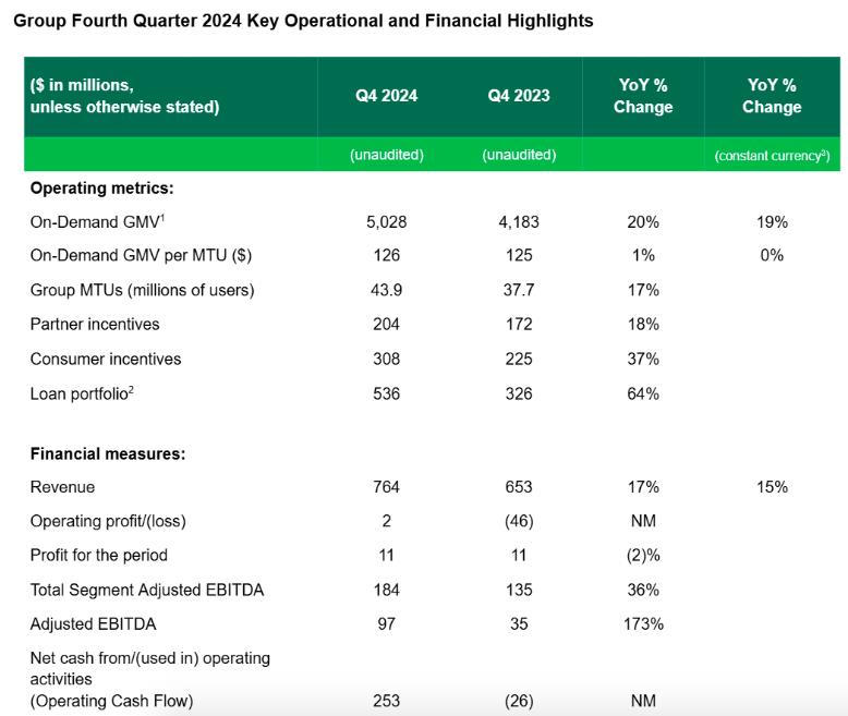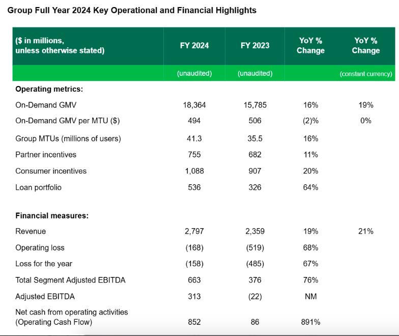 Tính chung cả năm 2024, Grab ghi nhận doanh thu tăng 19%, đạt 2,79 tỷ USD nhờ nhu cầu cao hơn đối với dịch vụ gọi xe và giao đồ ăn. Công ty báo lỗ sau thuế 158 triệu USD, giảm đáng kể so với mức lỗ 485 triệu USD của năm 2023.