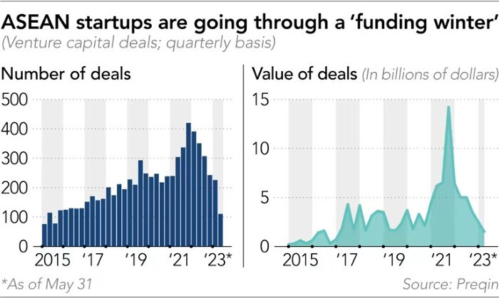 Tính đến ngày 31/5, vốn đầu tư mạo hiểm cho các startup ở Đông Nam Á chỉ đạt 4 tỷ USD, giảm 65% so với 6 tháng đầu năm 2022, theo công ty dữ liệu đầu tư Preqin có trụ sở tại Vương quốc Anh. Đây cũng là mức thấp nhất kể từ nửa cuối năm 2019. Vốn đầu tư vào Indonesia và Singapore đã giảm lần lượt 70% và 65% từ đầu năm.
