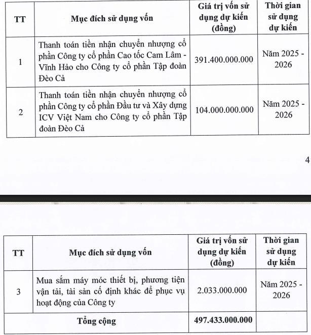 Với số tiền dự kiến huy động được là hơn 497 tỷ đồng từ chào bán cho cổ đông đợt này, công ty sẽ dùng hơn 391 tỷ đồng để thanh toán tiền nhận chuyển nhượng cổ phần CTCP Cao tốc Cam Lâm Vĩnh Hảo và 104 tỷ đồng thanh toán tiền mua cổ phần CTCP Đầu tư Xây dựng ICV Việt Nam.