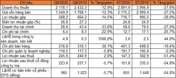 Lũy kế 6 tháng, doanh nghiệp ghi nhận doanh thu thuần đạt 2.892 tỷ đồng, giảm 28%. Lợi nhuận sau thuế là 147 tỷ đồng, giảm 51% và lợi nhuận sau thuế cổ đông công ty mẹ là 152 tỷ đồng, giảm 55%.