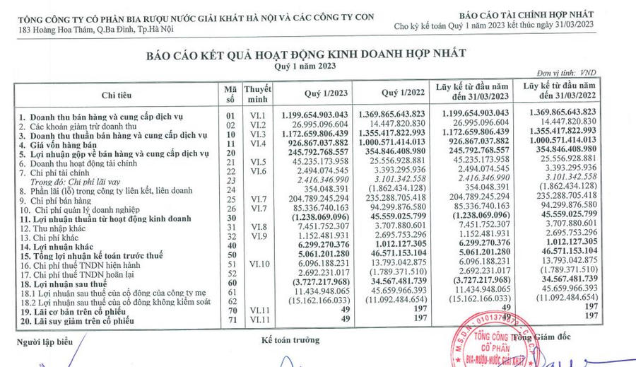 Tổng Công ty cổ phần Bia - Rượu - Nước giải khát Hà Nội (Habeco - mã CK: BHN) vừa công bố báo cáo tài chính hợp nhất quý I/2023 với kết quả không mấy khả quan.