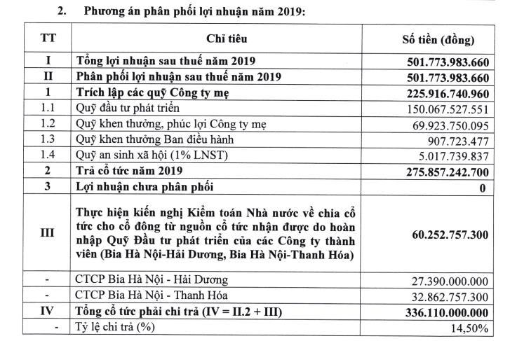 Nếu phương án này được thông qua, cổ đông của Habeco sẽ nhận được tổng cổ tức tiền mặt tỷ lệ 28,3%, tương ứng mỗi cổ phiếu được trả 2.830 đồng. Habeco sẽ dự chi khoảng 656 tỷ đồng trả cổ tức cho 231,8 triệu cổ phiếu đang lưu hành.