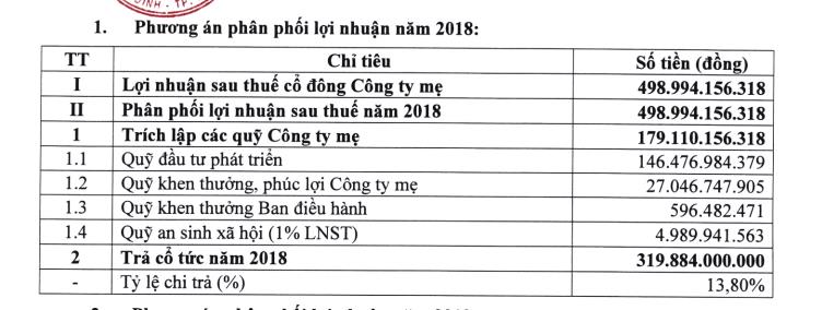Theo phương án trình cổ đông, số tiền trả cổ tức năm 2018 là 320 tỷ đồng, tương ứng tỷ lệ 13,8%. Năm 2019 dự kiến cao hơn với 336 tỷ đồng, tương ứng tỷ lệ 14,5%.