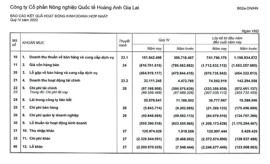Do kinh doanh dưới giá vốn nên công ty lỗ gộp gần 465 tỷ đồng quý IV/2022. Trừ đi các chi phí, HNG lỗ sau thuế 2.793 tỷ đồng. Trong đó, lỗ thuần về hoạt động kinh doanh hơn 555 tỷ đồng; lỗ do ghi nhận chi phí chuyển đổi vườn cây hơn 2.127 tỷ đồng và lỗ khác gần 111 tỷ đồng.