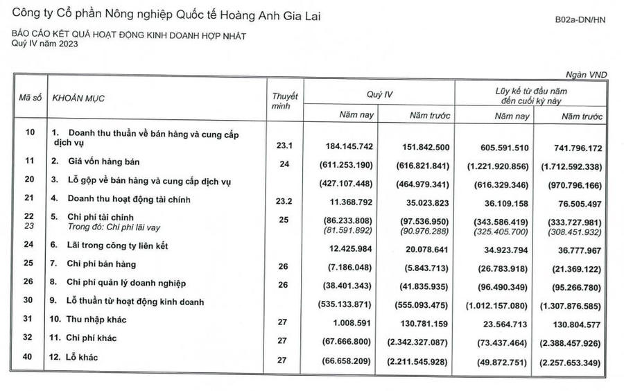 Về bức tranh tài chính, trong quý IV/2023, HNG ghi nhận doanh thu thuần đạt 184,1 tỷ đồng, tăng hơn 20% so với cùng kỳ năm trước. Tình trạng kinh doanh dưới giá vốn khiến công ty lỗ gộp 427 tỷ.