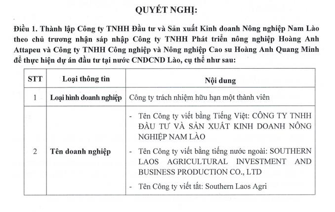 Công ty Nông nghiệp Quốc tế Hoàng Anh Gia Lai (HAGL Agrico - mã ck: HNG) vừa công bố Nghị quyết Hội đồng quản trị về việc thành lập Công ty TNHH Đầu tư và Sản xuất kinh doanh nông nghiệp Nam Lào (Southern Laos Agri), với tỷ lệ sở hữu 100%.