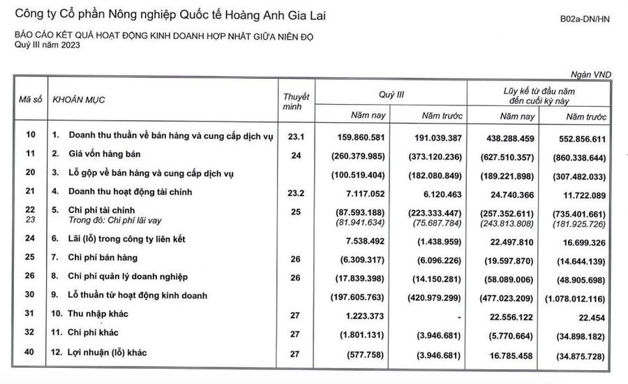 Về kết quả kinh doanh, lũy kế 9 tháng đầu năm, doanh thu thuần của HAGL Agrico ở mức 438,2 tỷ đồng, giảm 21% so với cùng kỳ. Công ty lỗ sau thuế 446 tỷ đồng, cải thiện hơn so với mức lỗ 1.085 tỷ đồng cùng kỳ năm trước.