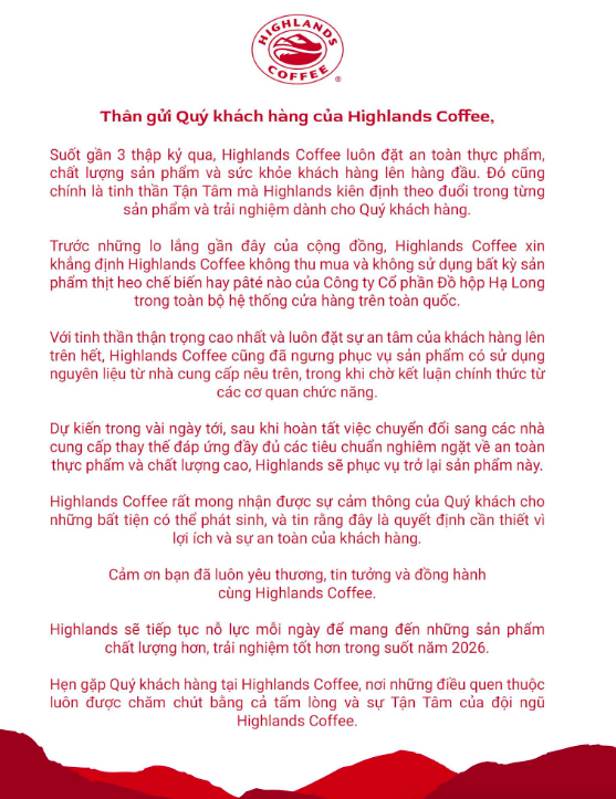 Trong thông báo phát đi, Highlands Coffee - thuộc CTCP Dịch vụ Cà phê Cao Nguyên khẳng định không thu mua và không sử dụng bất kỳ sản phẩm thịt heo chế biến nào từ Công ty cổ phần Đồ hộp Hạ Long cho toàn bộ danh mục sản phẩm trên hệ thống toàn quốc.