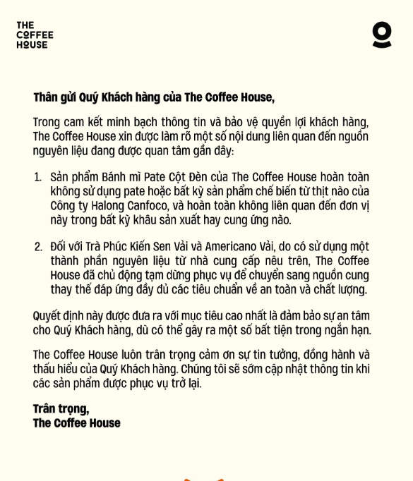 Thứ hai, đối với hai loại thức uống là Trà Phúc Kiến Sen Vải và Americano Vải, The Coffee House xác nhận có sử dụng một thành phần nguyên liệu từ Canfoco. Do đó, chuỗi đã chủ động tạm dừng phục vụ hai loại đồ uống này để chuyển đổi sang nguồn cung ứng thay thế nhằm đáp ứng các tiêu chuẩn về an toàn và chất lượng.