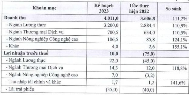Cụ thể, Angimex công bố doanh thu 2022 ước đạt 3.607 tỷ đồng và lỗ trước thuế 75 tỷ đồng. Tuy nhiên công ty vẫn khá lạc quan khi đặt mục tiêu doanh thu 2023 tăng trưởng 11% lên 4.011 tỷ đồng và có lãi 10 tỷ đồng trước đó.