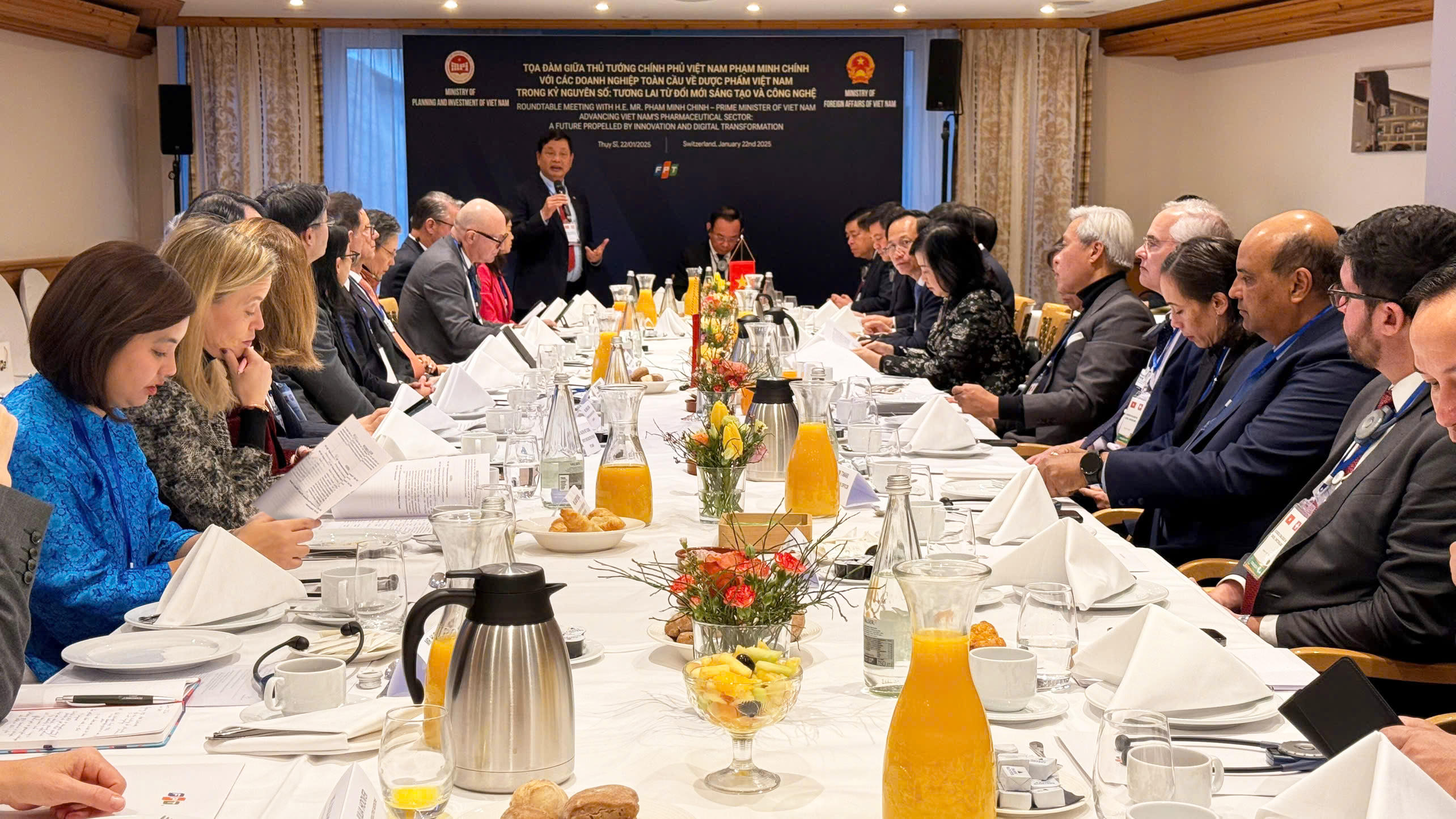 Ngày 22/1 (theo giờ địa phương), tại Davos, Thụy Sĩ, trong khuôn khổ chuyến công tác tham dự Hội nghị Diễn đàn Kinh tế Thế giới (WEF), Đoàn đại biểu cấp cao Việt Nam đã tham dự Tọa đàm với các tập đoàn dược phẩm toàn cầu với chủ đề: "Dược phẩm Việt Nam trong kỷ nguyên số - Tương lai từ đổi mới sáng tạo và công nghệ”. Sự kiện do Bộ Kế hoạch và Đầu tư, Bộ Ngoại giao và Tập đoàn FPT phối hợp tổ chức.