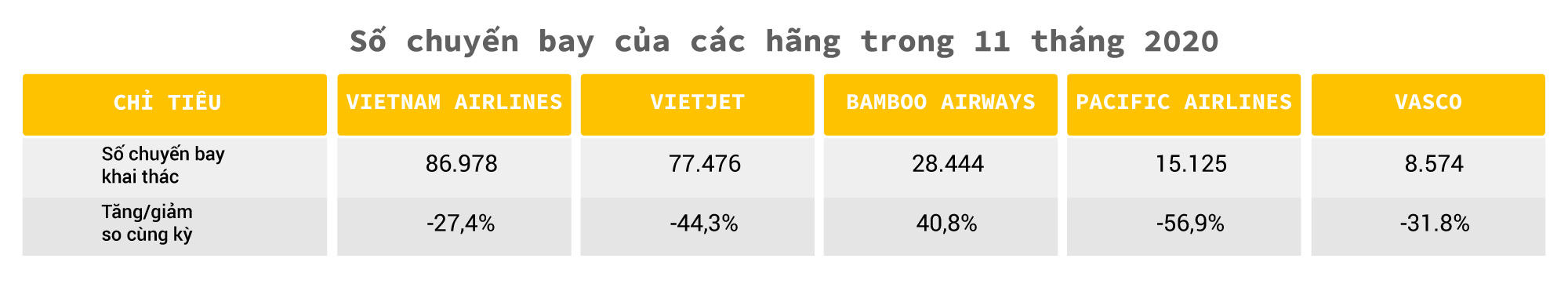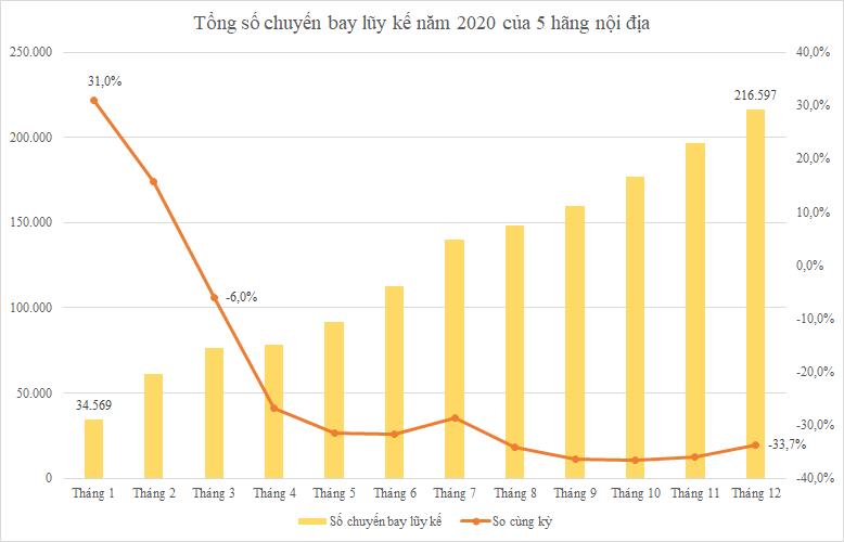 Khi chưa có Covid-19, hàng không Việt Nam thậm chí tăng trưởng đến 31% trong tháng 1/2020. Tuy nhiên, đại dịch bùng phát ngay sau Tết Âm lịch và các lệnh giãn cách xã hội sau đó khiến tình hình xấu đi nhanh chóng. Các đường bay quốc tế - vốn chiếm 60% doanh thu bắt đầu bị thu hẹp. Tới tháng 3, toàn bộ các đường bay quốc tế bị tạm dừng. Các đường bay nội địa cũng chỉ “thoi thóp” vài chuyến mỗi ngày trong tháng 4.