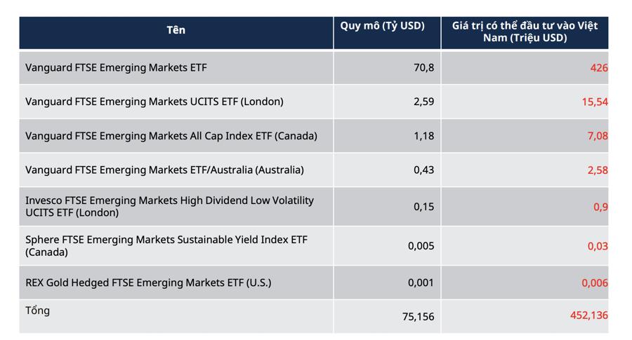 Tổng hợp một số quỹ ETF sử dụng FTSE Emerging markets Index làm tham chiếu, với tỷ trọng phân bổ 0,6%, Việt Nam có thể nhận đầu tư như bảng giả định bên dưới, ước tính khoảng 452 triệu USD (gần 11.000 tỷ đồng).