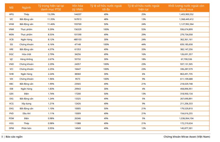 Mirae Asset đưa ra dự báo các mã cổ phiếu trong danh mục hiện tại của FTSE sẽ được hưởng lợi nếu nâng hạng thành công.