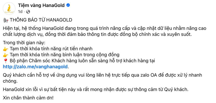 Cùng thời điểm, nền tảng vàng kỹ thuật số HanaGold cũng phát đi thông báo tạm khóa tính năng rút tiền nhanh, làm gián đoạn việc rút vốn của khách hàng. Tình trạng ngưng trệ thanh khoản tại hai ứng dụng tạo ra tâm lý lo ngại về mức độ an toàn tài sản của cộng đồng người dùng.