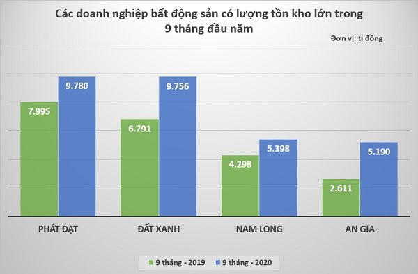 Với Nam Long, tính đến cuối tháng 9, tổng tài sản Nam Long đạt khoảng 11.803 tỷ đồng, tăng hơn 8%. Trong đó, gần một nửa giá trị tài sản là hàng tồn kho, tương ứng 5.398 tỷ đồng, tăng 26% so với cùng kỳ. Các dự án chiếm giá trị hàng tồn kho lớn nhất gồm Paragon Đại Phước (1.706 tỷ đồng), Akari (1.685 tỷ đồng) và Waterpoint (1.091 tỷ đồng).