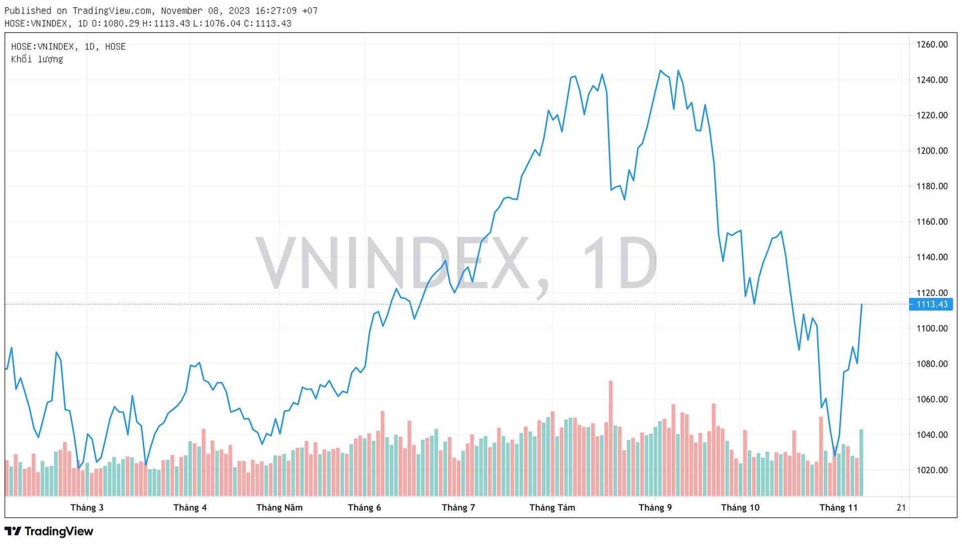 Thị trường chứng khoán ghi nhận phiên giao dịch 8/11 bùng nổ hơn 33 điểm với thanh khoản khớp lệnh tăng vọt vượt ngưỡng 17.000 tỷ đồng. Phiên tăng điểm đột phá nhanh chóng giúp VN-Index tiến lên 1.113 điểm, tương đương tăng xâpx xỉ 9% kể từ vùng thấp nhất từng chạm đến.