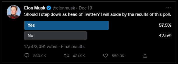 Nguồn tin CNBC cho rằng việc Elon Musk tìm CEO mới cho Twitter đã bắt đầu từ trước đây tương đối lâu, trước cả thời điểm cuộc bình chọn diễn ra. Việc tiếp quản Twitter đã tạo nhiều ảnh hưởng tiêu cực tới Elon Musk không những ở Twitter mà còn ở các doanh nghiệp khác do ông điều hành, trong đó quan trọng nhất là Tesla.
