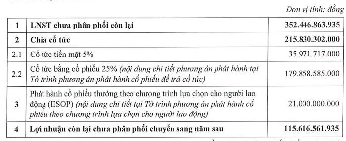 Bên cạnh đó, công ty sẽ trả cổ tức bằng cổ phiếu tỷ lệ 25%, tương ứng với việc phát hành hơn 17,9 triệu cổ phiếu. Tỷ lệ thực hiện quyền là 4:1, điều đó có nghĩa là mỗi cổ đông sở hữu 40 cổ phiếu cũ sẽ nhận về 10 cổ phiếu mới. Thời gian phát hành sẽ do Hội đồng quản trị lựa chọn để đảm bảo quyền lợi cho cổ đông.