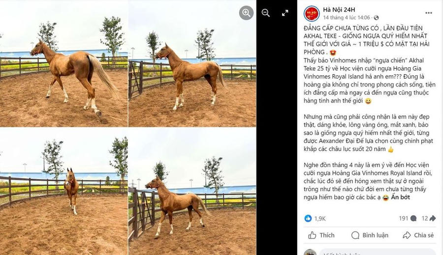 Những ngày gần đây, mạng xã hội xôn xao về việc giống ngựa quý hiếm và đắt đỏ bậc nhất hành tinh Akhal Teke vừa chính thức có mặt tại Học viện cưỡi ngựa Hoàng Gia của Vinhomes Royal Island (Vũ Yên, Hải Phòng). Đây là giống ngựa đẹp, quý hiếm nhất hành tinh và là hậu duệ thuần chủng duy nhất của ngựa Turkmene cổ đại, biểu tượng cho sức mạnh, sự dẻo dai và sức sống mãnh liệt, thích nghi được với khí hậu khô nóng của sa mạc.