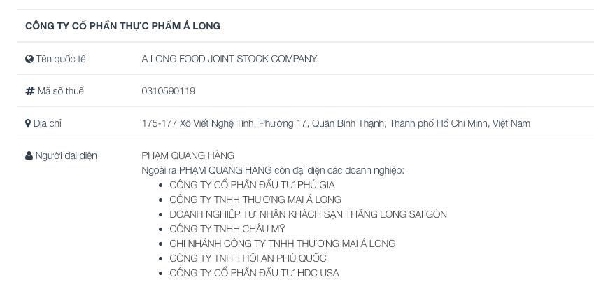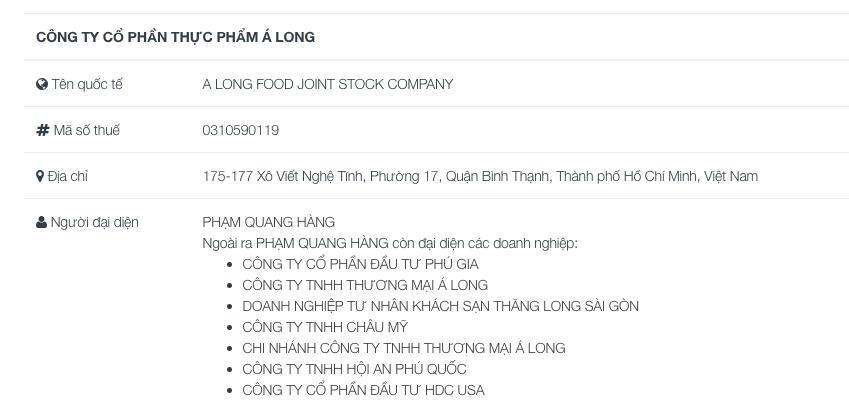 Theo dữ liệu từ Cổng thông tin Quốc gia về đăng ký doanh nghiệp, Công ty cổ phần Thực phẩm Á Long được thành lập vào ngày 17/1/2011, có trụ sở chính tại quận Bình Thạnh, TP HCM. Công ty hoạt động chính trong lĩnh vực bán buôn thực phấm. Người đại diện theo pháp luật là ông Phạm Quang Hàng - Chủ tịch HĐQT.