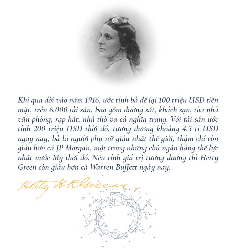 Nếu chỉ nổi lên với những phi vụ đầu tư "chi một được ba", có lẽ tên tuổi của Hetty Green chẳng được nhiều người nhớ tới. Sau hai thế kỷ, những thông tin người ta tìm được về "phù thủy phố Wall" là một nhà đầu tư máu lạnh và keo kiệt tới mức... bủn xỉn.