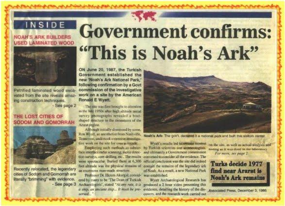 Vào ngày 20/6/1987, Thống đốc tỉnh Agri của Thổ Nhĩ Kỳ tuyên bố với thế giới rằng: Bộ Ngoại giao, Bộ Nội vụ, các nhà nghiên cứu thuộc trường Đại học Ataturk, cơ quan khảo cổ Thổ Nhĩ Kỳ… đã công nhận vật thể hình chiếc tàu trên ngọn núi Ararat tại độ cao 2.000m so với mực nước biển ấy là con tàu của Noah. Khu vực này trở thành công viên quốc gia, báu vật quốc gia của họ. Đây là một trong những phát hiện lịch sử học và khảo cổ học vĩ đại nhất, cho thấy đại hồng thủy và con tàu Noah là sự thật.