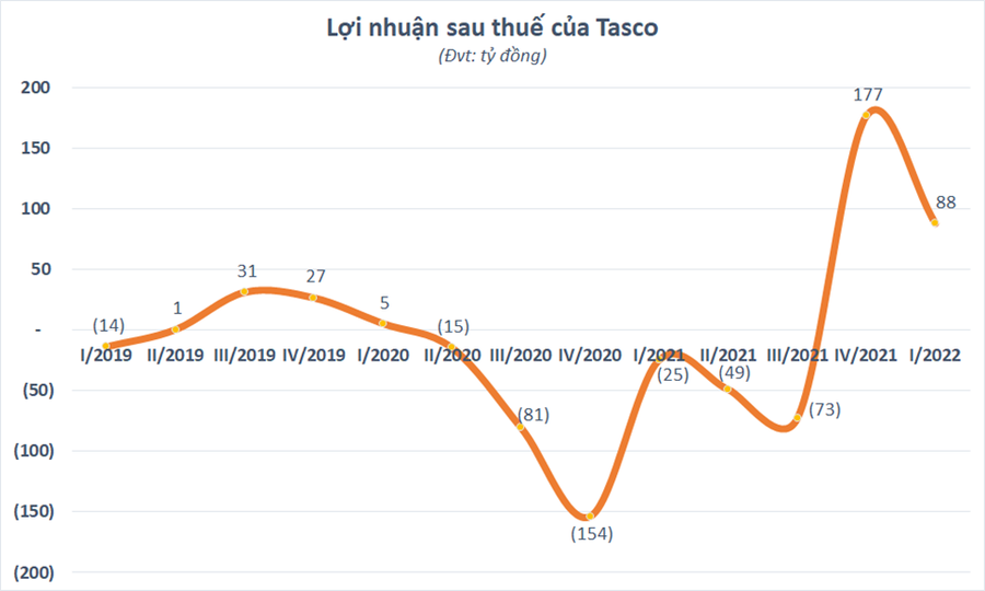 Trong quý 1/2022, Tasco ghi nhận doanh thu thuần gần 240 tỷ đồng, chỉ nhích nhẹ so với cùng kỳ năm ngoái. Trong đó, hoạt động thu phí vẫn chiếm tỷ trọng lớn nhất, với gần 180 tỷ đồng. Nhờ doanh thu tài chính tăng đột biến lên 126 tỷ đồng chủ yếu đến từ lãi thoái vốn, chuyển nhượng đầu tư, Tasco lãi ròng 88,2 tỷ đồng trong khi cùng kỳ lỗ hơn 24,5 tỷ đồng.