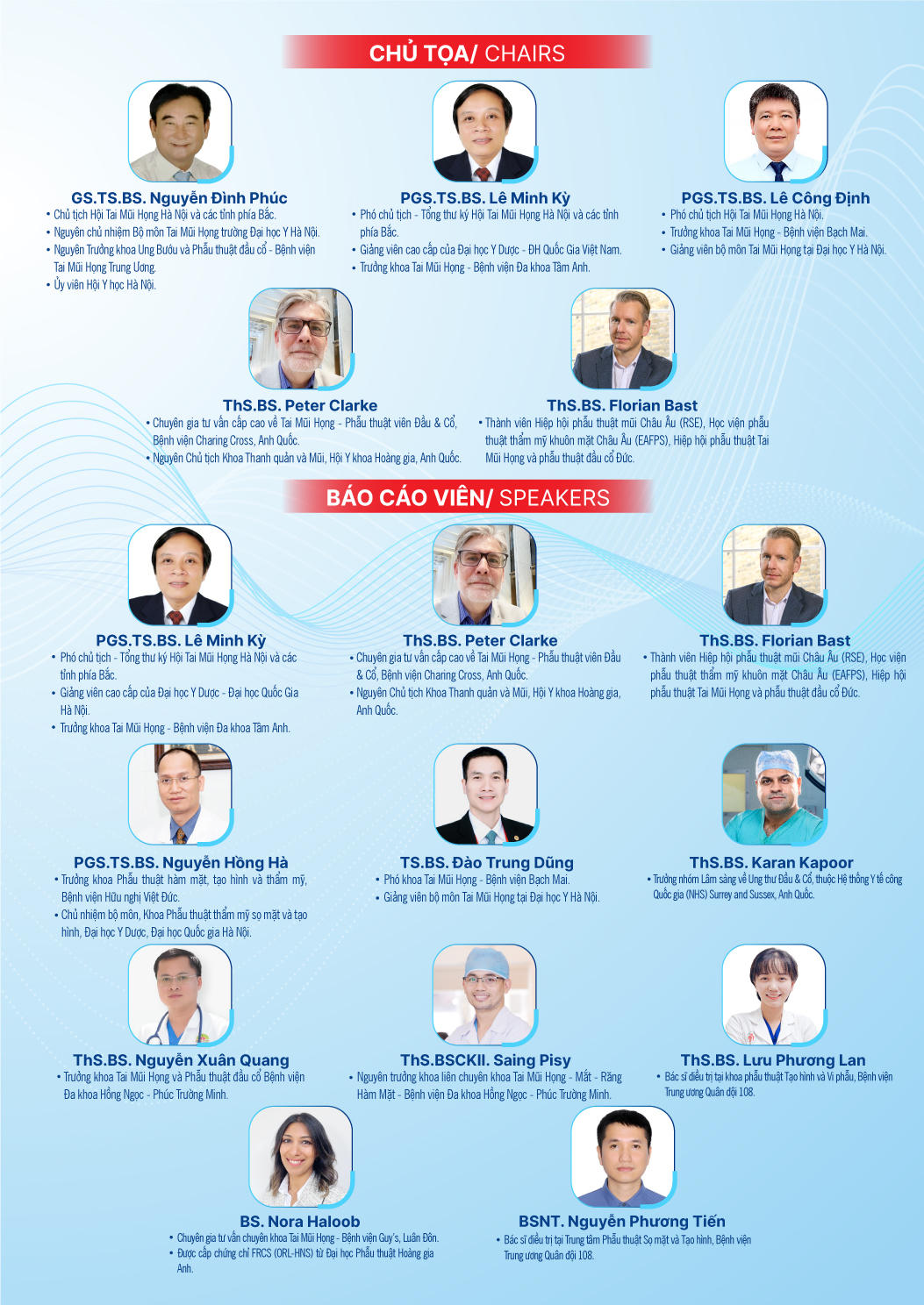 - Peter Clarke, thành viên tổ chức Facing The World, chuyên gia hàng đầu về Tai Mũi Họng và Phẫu thuật Đầu & Cổ từ Bệnh viện Charing Cross, Anh Quốc, sẽ báo cáo các kỹ thuật hiện đại trong điều trị hẹp hầu họng, kiểm soát dây thần kinh mặt trong phẫu thuật cắt tuyến mang tai và phẫu thuật ung thư đầu cổ…