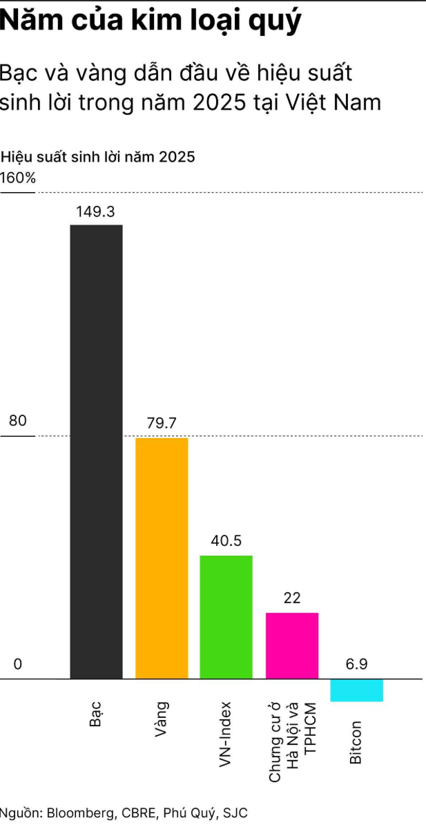 Hiệu suất đầu tư 2025: Bạc tăng 149% 'áp đảo' vàng SJC, Bitcoin quay đầu giảm