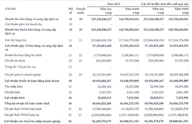 Năm 2023, công ty đặt mục tiêu tổng doanh thu hợp nhất 1.280 tỷ đồng và lợi nhuận sau thuế 205 tỷ đồng, lần lượt tăng hơn 35% và 46% so với thực hiện năm 2022.