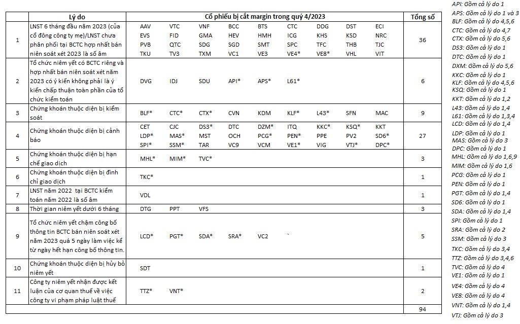 Một vài nguyên nhân dẫn đến việc cắt margin còn là việc tổ chức niêm yết chậm công bố thông tin BCTC bán niên soát xét năm 2023 quá 5 ngày làm việc kể từ ngày hết hạn công bố thông tin như LCD, PGT, SDA, SRA, VC2; hoặc công ty niêm yết nhận được kết luận của cơ quan thuế về việc công ty vi phạm pháp luật thuế như VNT, TTZ.