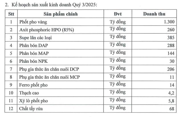 Về sản xuất, tập đoàn dự kiến doanh thu từ phốt pho vàng chiếm tỷ trọng lớn nhất với khoảng 1.300 tỷ đồng; tiếp đến là Supe lân các loại 385 tỷ, Phân bón DAP 288 tỷ, Axit phosphoric HPO (85%) ở mức 260 tỷ đồng...