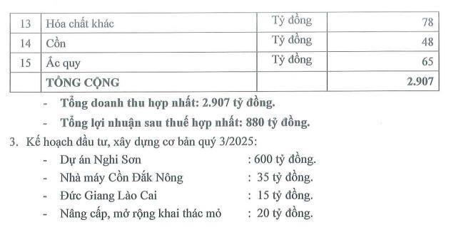 Về kế hoạch đầu tư, Đức Giang sẽ chi tổng cộng 670 tỷ đồng trong quý III/2025. Trong đó, doanh nghiệp tập trung cao độ vào dự án Tổ hợp hóa chất Đức Giang Nghi Sơn với giá trị rót khoảng 600 tỷ đồng; phần còn lại để đầu tư vào Nhà máy Cồn Đắk Nông, Đức Giang Lào Cai và mở rộng khai thác mỏ.