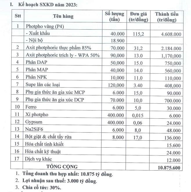 Năm 2023, công ty đặt kế hoạch 10.875 tỷ đồng tổng doanh thu hợp nhất, 3.000 tỷ đồng lợi nhuận sau thuế giảm lần lượt 25%, 50% so với năm trước. Mức chia cổ tức năm 2023 dự kiến là 30%, tương đương so với năm 2022.