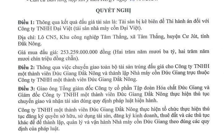 CTCP Tập đoàn Hóa chất Đức Giang (mã CK: DGC) công bố kết quả tham gia đấu giá mua tài sản là Nhà máy cồn Đại Việt.