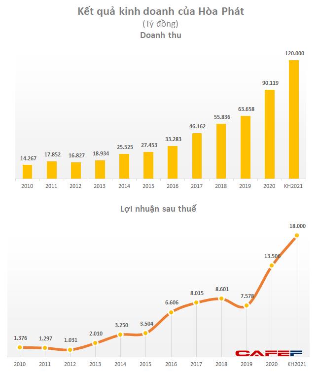 Theo đó, công ty đặt kế hoạch doanh thu toàn tập đoàn dự kiến 120.000 tỷ đồng, lợi nhuận sau thuế dự kiến 18.000 tỷ đồng, tăng lần lượt 33,15% và 33,27% so với thực hiện năm 2020. Như vậy, lời hứa với cổ đông của Chủ tịch Trần Đình Long 4 năm trước khi làm dự án nhà máy thép Hoà Phát Dung Quất đã trở thành hiện thực, khi mục tiêu doanh thu của Hoà Phát sẽ vượt 100.000 tỷ đồng sau khi Dung Quất đi vào hoạt động.