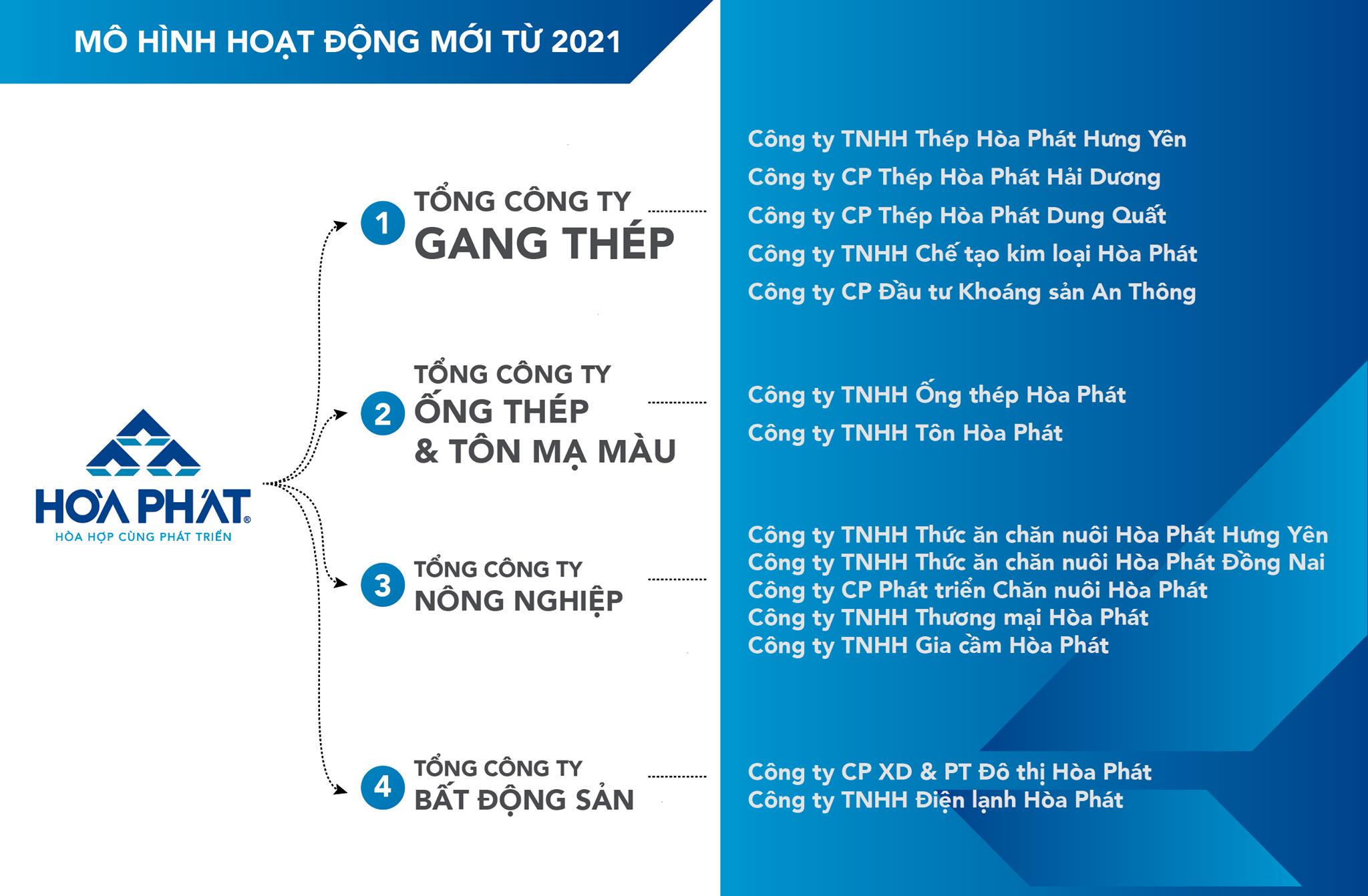 Hội đồng Quản trị Tập đoàn Hòa Phát (Mã CK: HPG) quyết định cơ cấu lại mô hình tổ chức với 4 tổng công ty phụ trách từng lĩnh vực hoạt động của tập đoàn, bao gồm: Tổng công ty Gang Thép, Tổng công ty Ống thép và Tôn mạ màu, Tổng công ty Phát triển Nông nghiệp, Tổng công ty Phát triển Bất động sản.