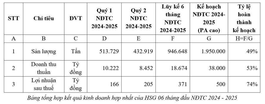 So với kế hoạch NĐTC 2024-2025 đã được Đại hội đồng cổ đông thông qua (phương án cao với lợi nhuận sau thuế 500 tỷ đồng), sau 6 tháng đầu niên độ, HSG đã hoàn thành 49% kế hoạch sản lượng, 53% kế hoạch doanh thu và đáng chú ý là hoàn thành tới 74% kế hoạch lợi nhuận đã đề ra. Điều này tương đương với mức lợi nhuận trung bình hơn 2 tỷ đồng mỗi ngày trong nửa đầu niên độ tài chính, khẳng định hiệu quả kinh doanh tích cực của tập đoàn.