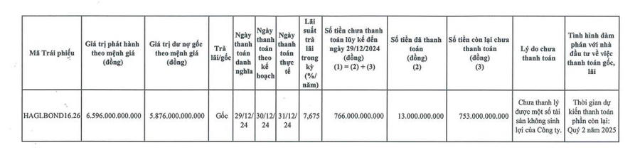 Ngày 31/12/2024, Công ty Hoàng Anh Gia Lai đã thanh toán một phần gốc trái phiếu HAGLBOND16.26 do công ty phát hành năm 2016.