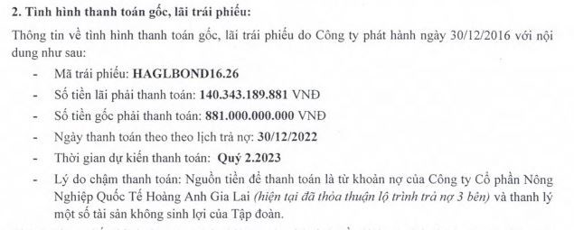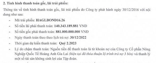 Thông cáo được đưa ra sau khi doanh nghiệp này xin dời lịch thanh toán một phần tiền gốc và lãi trái phiếu với tổng giá trị 1.021 tỷ đồng cho mã lô trái phiếu HAGLBOND16.26. Lô trái phiếu này có lịch trả nợ vào ngày 30/12/2022, số tiền thanh toán gốc là 881 tỷ đồng và tiền lãi hơn 140 tỷ đồng. Tuy nhiên công ty xin lùi thời hạn thanh toán sang quý II/2023.