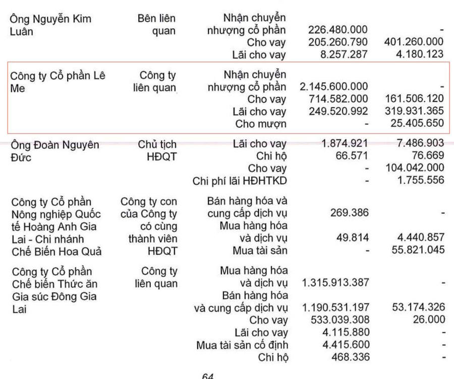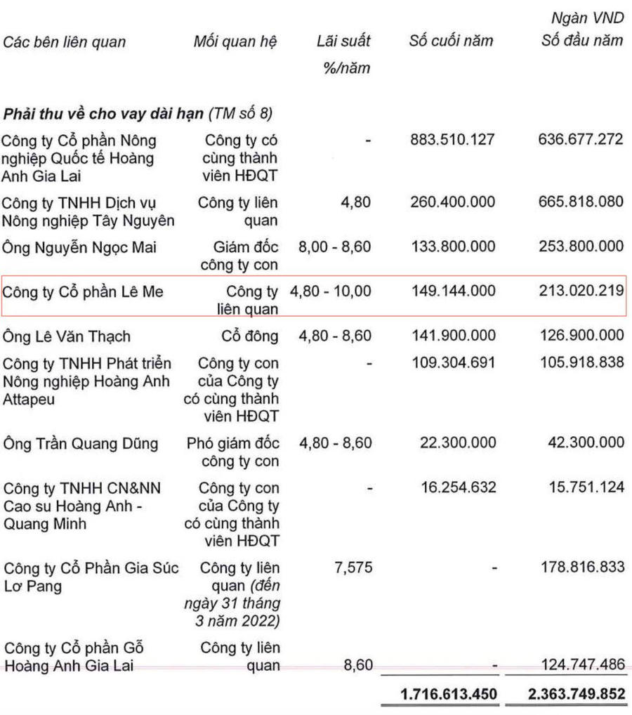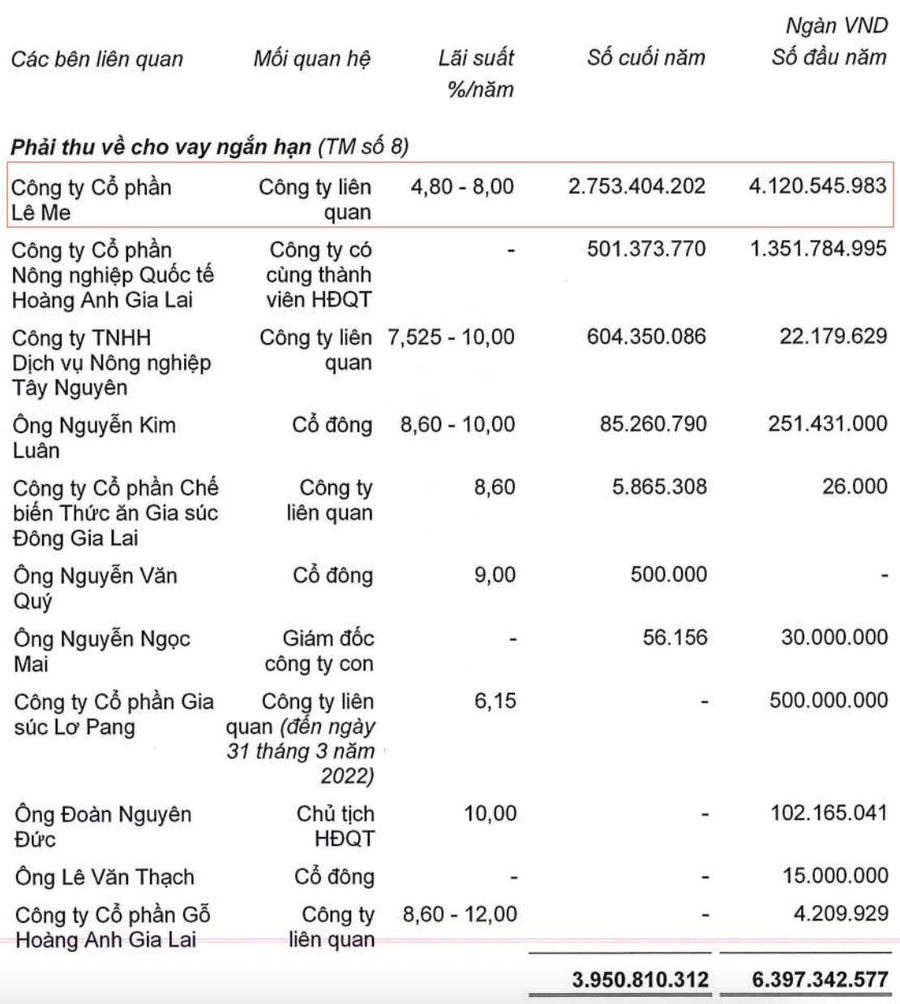 Tính đến cuối năm 2022, khoản phải thu về cho vay ngắn hạn của HAGL với các bên liên quan là 3.951 tỷ đồng, riêng Lê Me chiếm 2.753 tỷ. Khoản phải thu về cho vay dài hạn là 1.717 tỷ đồng, Lê Me chiếm 149 tỷ đồng.