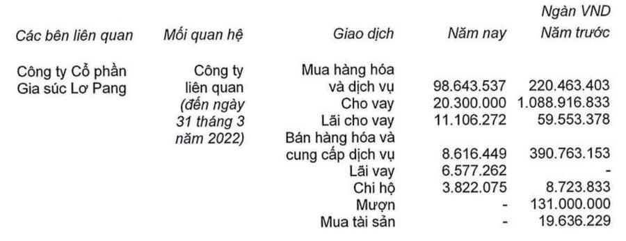 Lơ Pang và Chăn nuôi Gia Lai cũng là 2 đơn vị ghi nhận giao dịch giá trị lớn với HAGL trong năm. Riêng năm 2022, HAGL bán hàng hoá cho Lơ Pang với giá trị 99 tỷ đồng, song song đang cho vay 20 tỷ đồng. Đến cuối năm, mọi khoản phải thu từ Lơ Pang không còn.