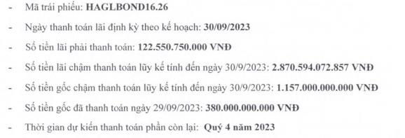 Theo văn bản của HAG, doanh nghiệp cho biết, tổng gốc, lãi chậm thanh toán lũy kế tính đến ngày 30/09/2023 liên quan đến lô trái phiếu này là hơn 4.000 tỷ đồng; trong đó số tiền lãi chậm thanh toán là hơn 2.870 tỷ đồng; tiền gốc chậm thanh toán là 1.157 tỷ đồng; số tiền lãi phải thanh toán là 122,5 tỷ đồng.