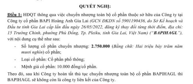 Cụ thể, HAGL sẽ chuyển nhượng toàn bộ 2,75 triệu cổ phiếu đang nắm giữ tại Bapi Hoàng Anh Gia Lai.