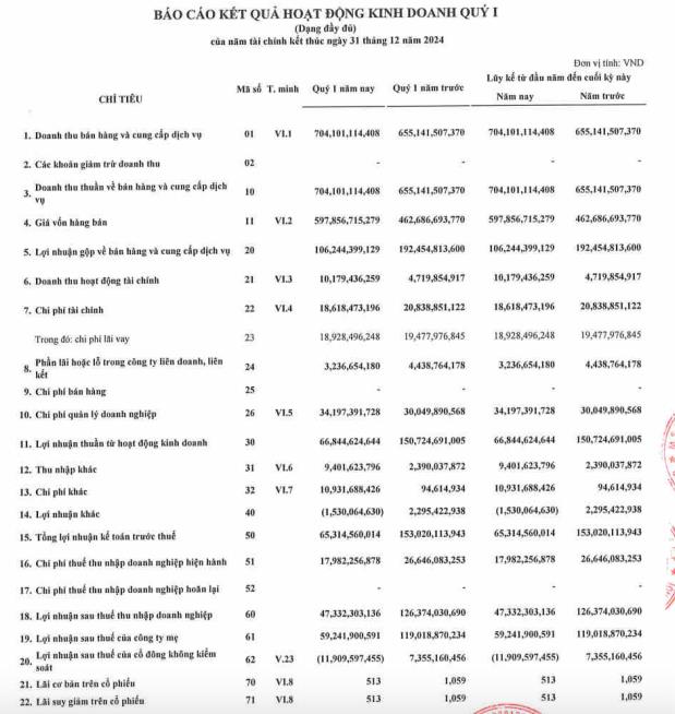 Cụ thể, trong 3 tháng đầu năm, Công ty ghi nhận doanh thu thuần đạt 704,1 tỷ đồng, tăng 7% so với cùng kỳ năm ngoái.