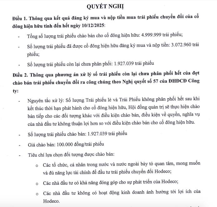 Theo đó, tính đến hết ngày 10/12/2025, các cổ đông hiện hữu của Hodeco đã đăng ký và nộp tiền mua 3,072 triệu trái phiếu chuyển đổi trong tổng số hơn 4,99 triệu trái phiếu mã HDC425001 chào bán. Số trái phiếu còn lại chưa được phân phối là hơn 1,9 triệu đơn vị.